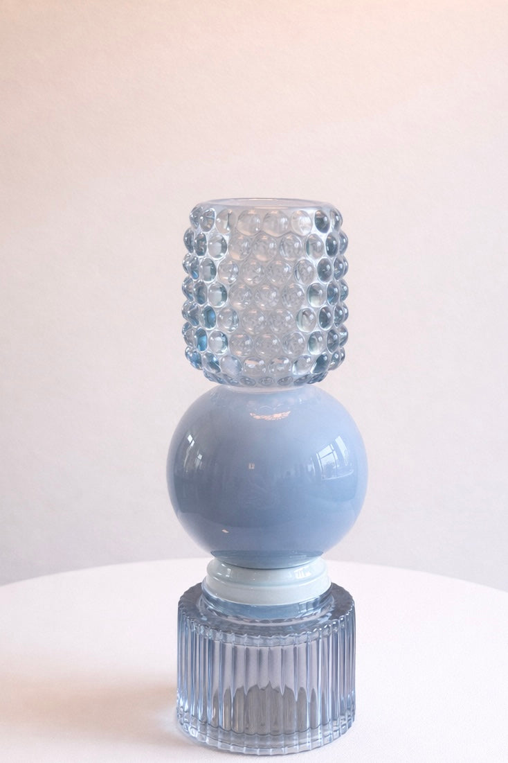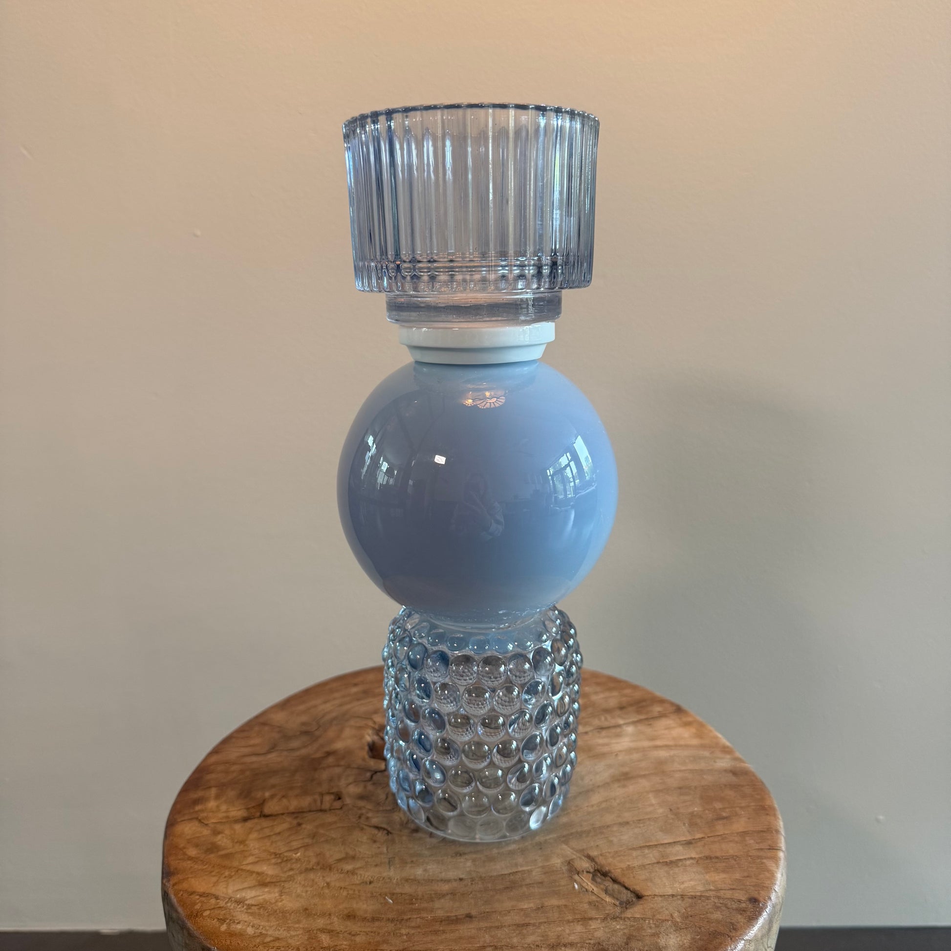 De naam aqua heeft de kandelaar te danken aan zijn prachtige blauwe kleuren. Het is een robbuste kandelaar van ongeveer 25cm hoog.