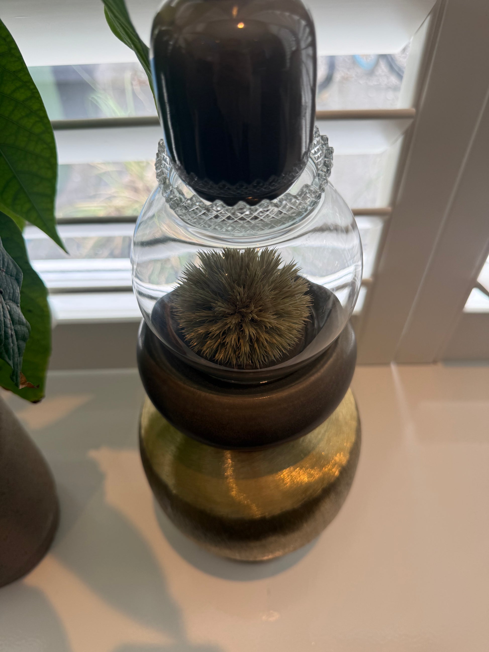 In het midden zit een groene gedroogde 'Leonotis leonurus' verwerkt, ook wel leeuwenstaart genoemd. Leeuwenstaart staat symbool voor levendigheid en energie.